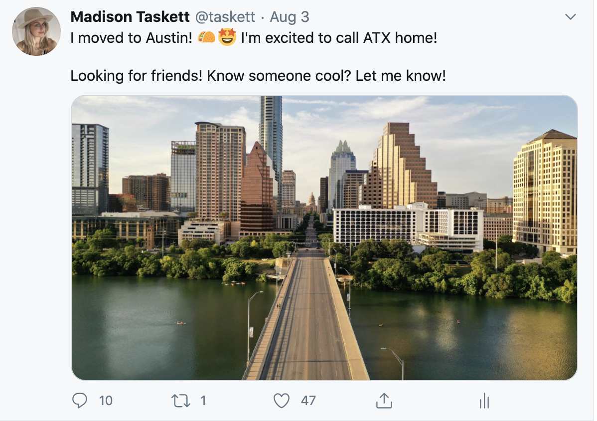 - an intro post saying, "I moved to Austin!" with a clear 'please be friends' CTA. I kept this really short and upbeat, and only asked for ONE SIMPLE thing- let me know who you know!